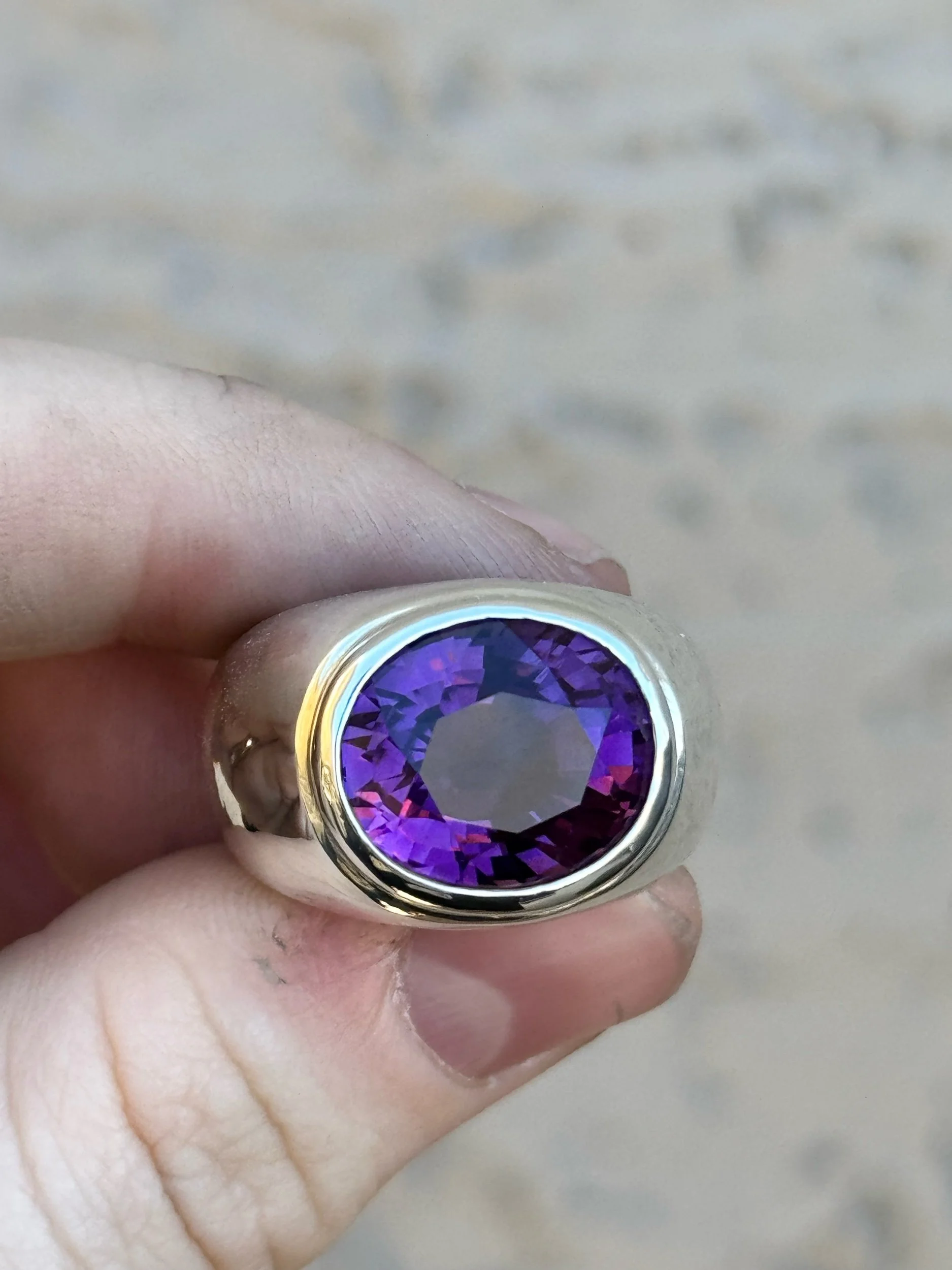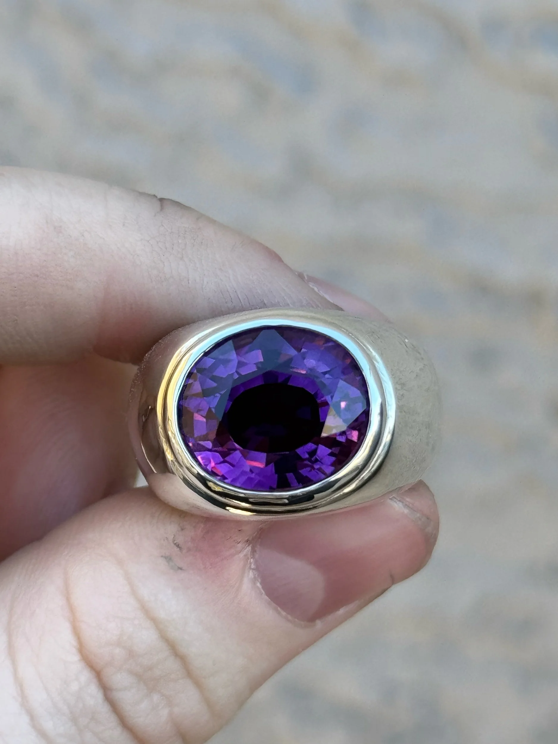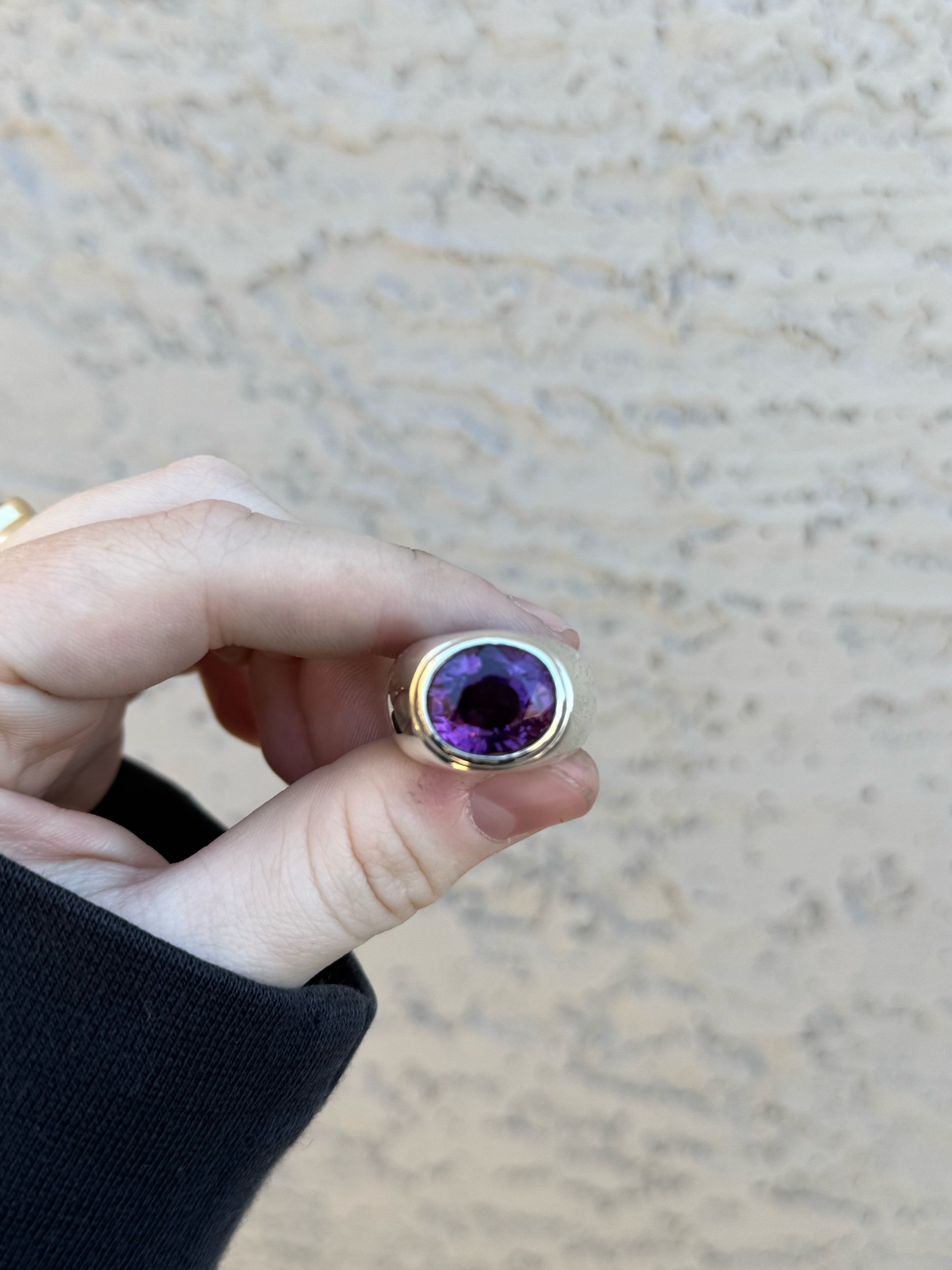 10.9ct Amethyst set in 925 Sterling Silver. Hand carved from wax, sand casted, filed, set, and polished. Size 8 US. Weighs about 28g.