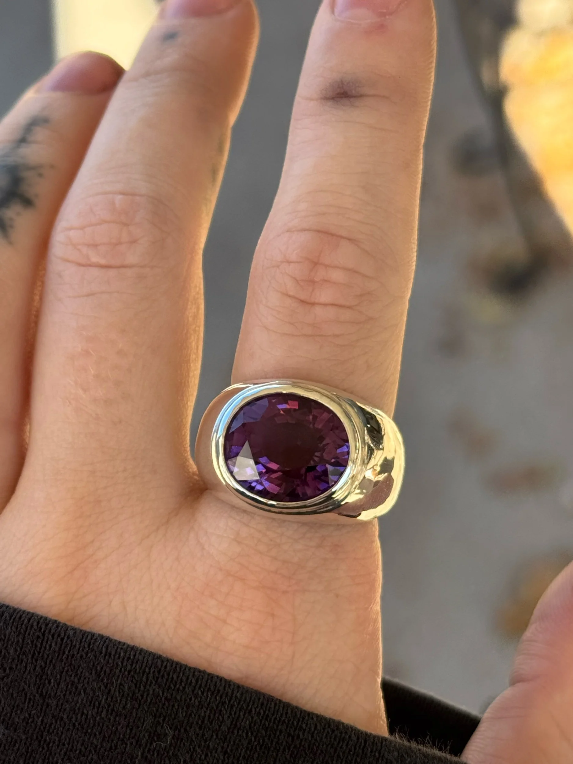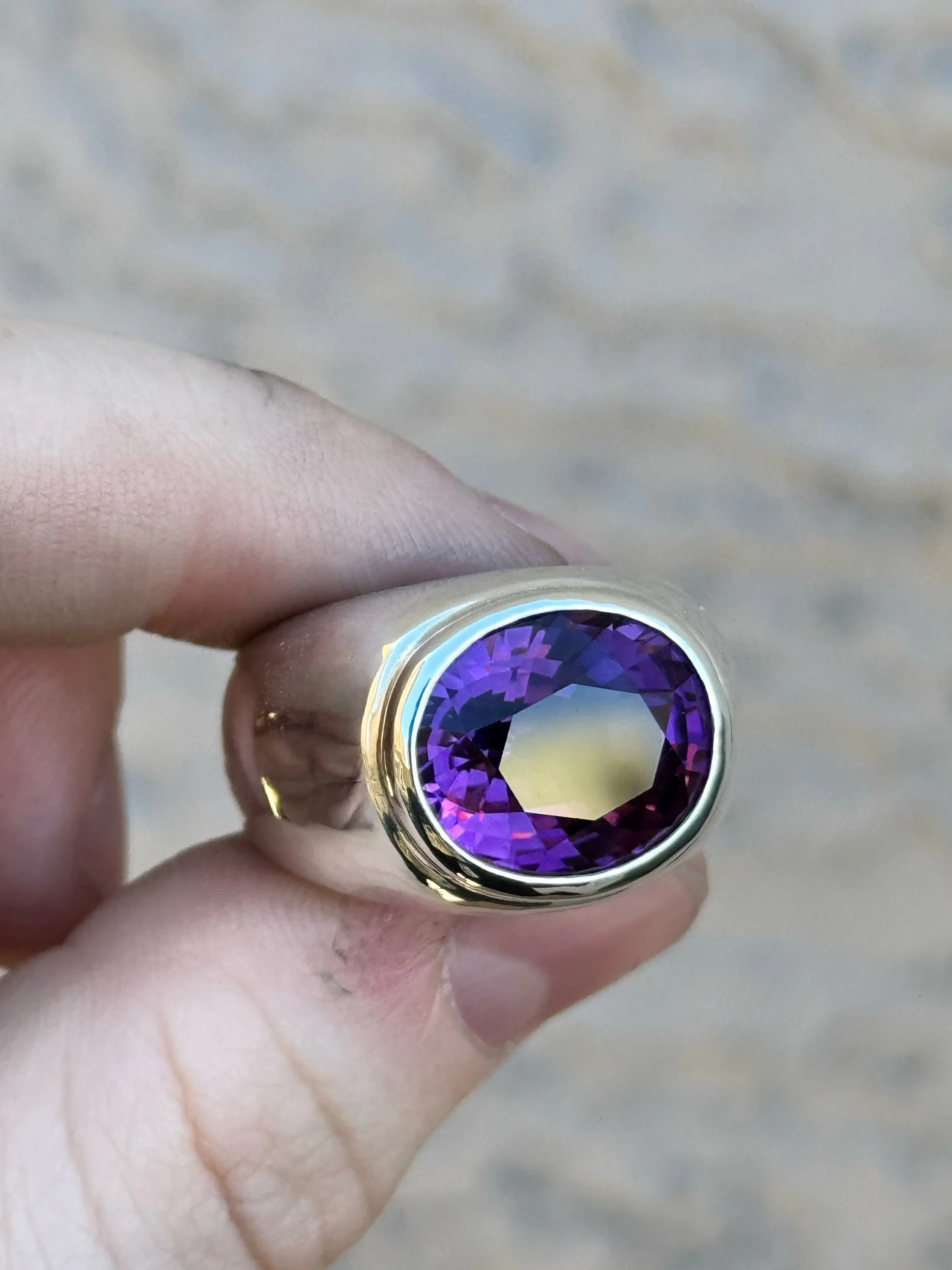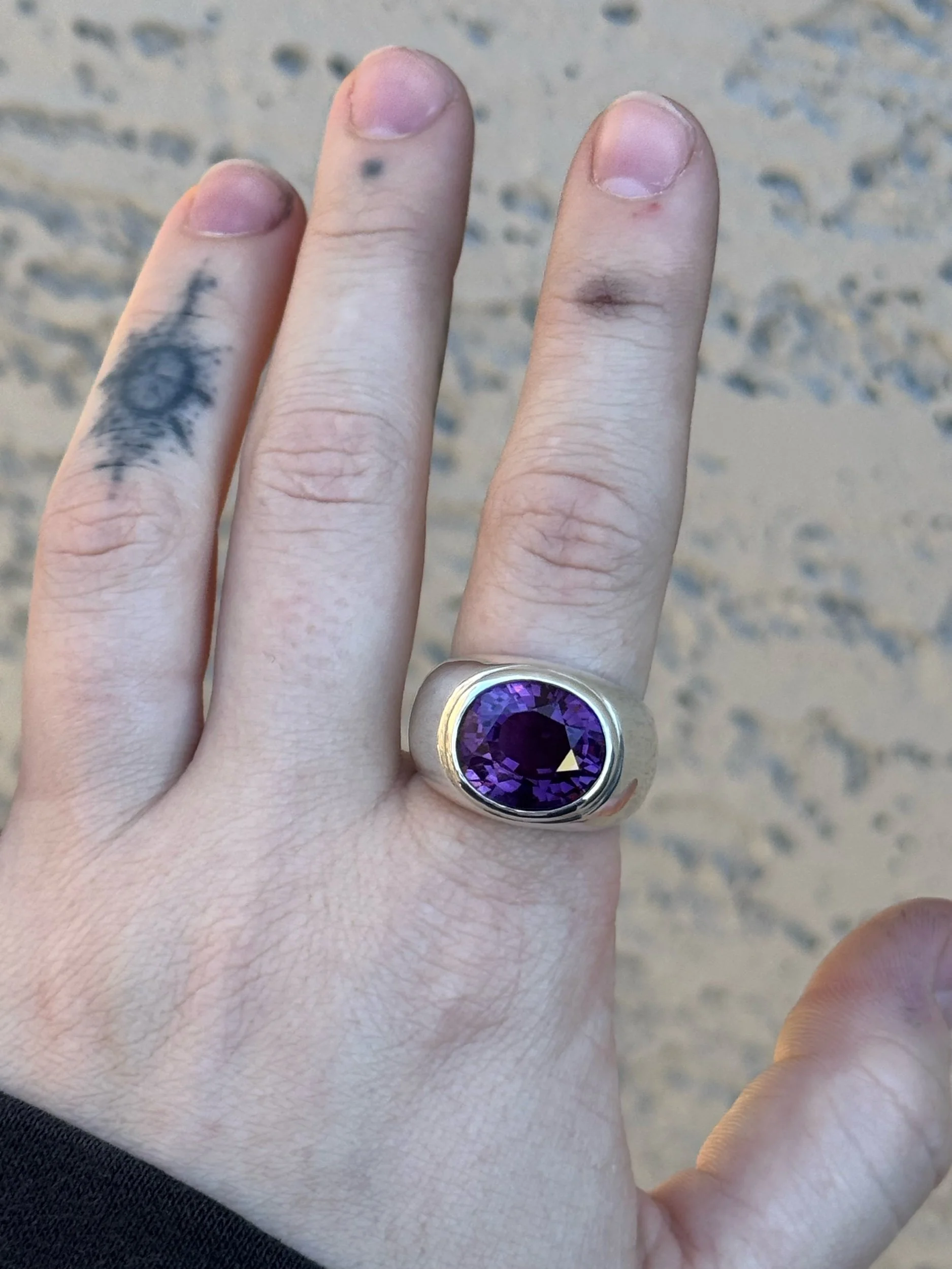 10.9ct Amethyst set in 925 Sterling Silver. Hand carved from wax, sand casted, filed, set, and polished. Size 8 US. Weighs about 28g.