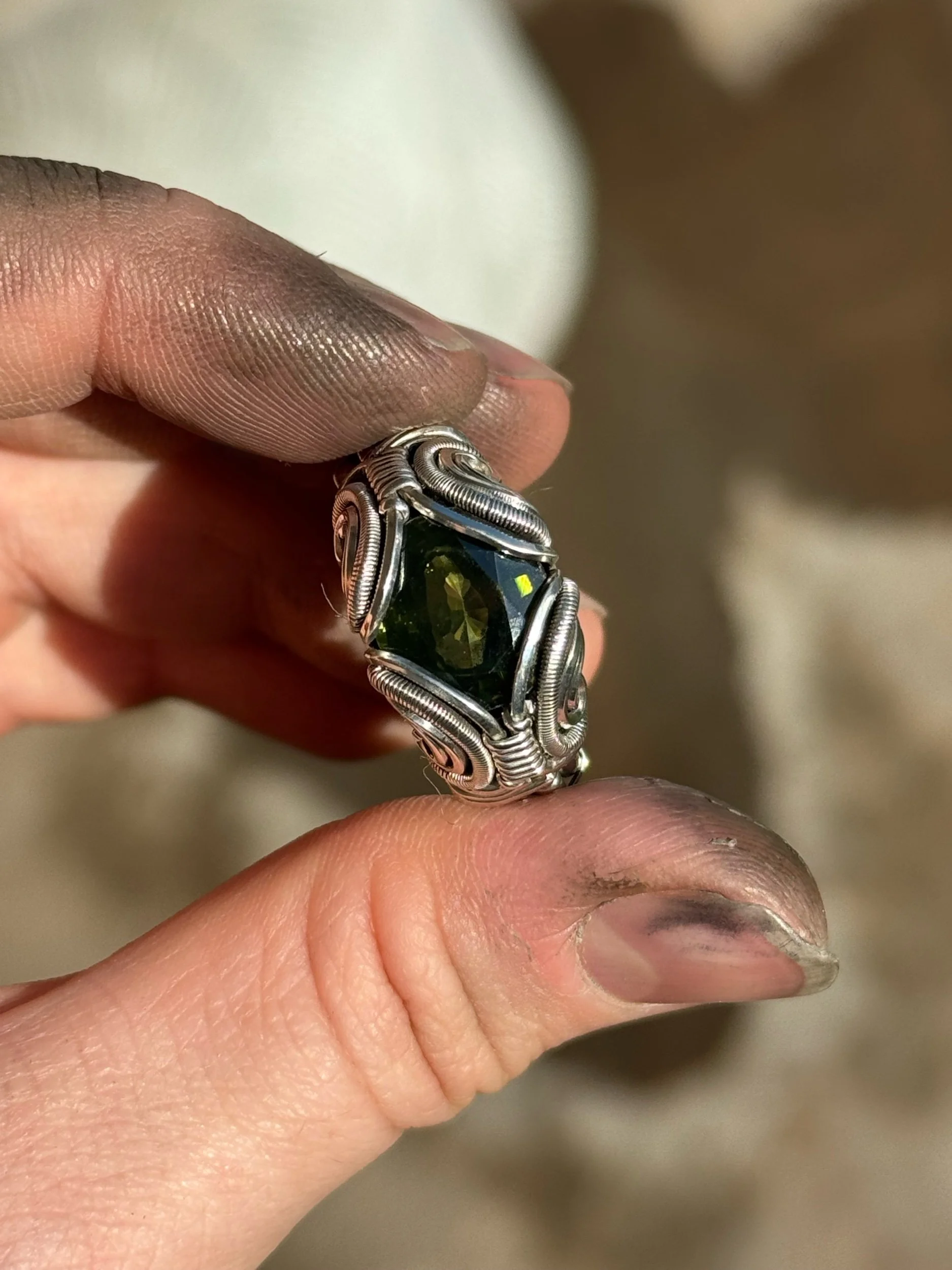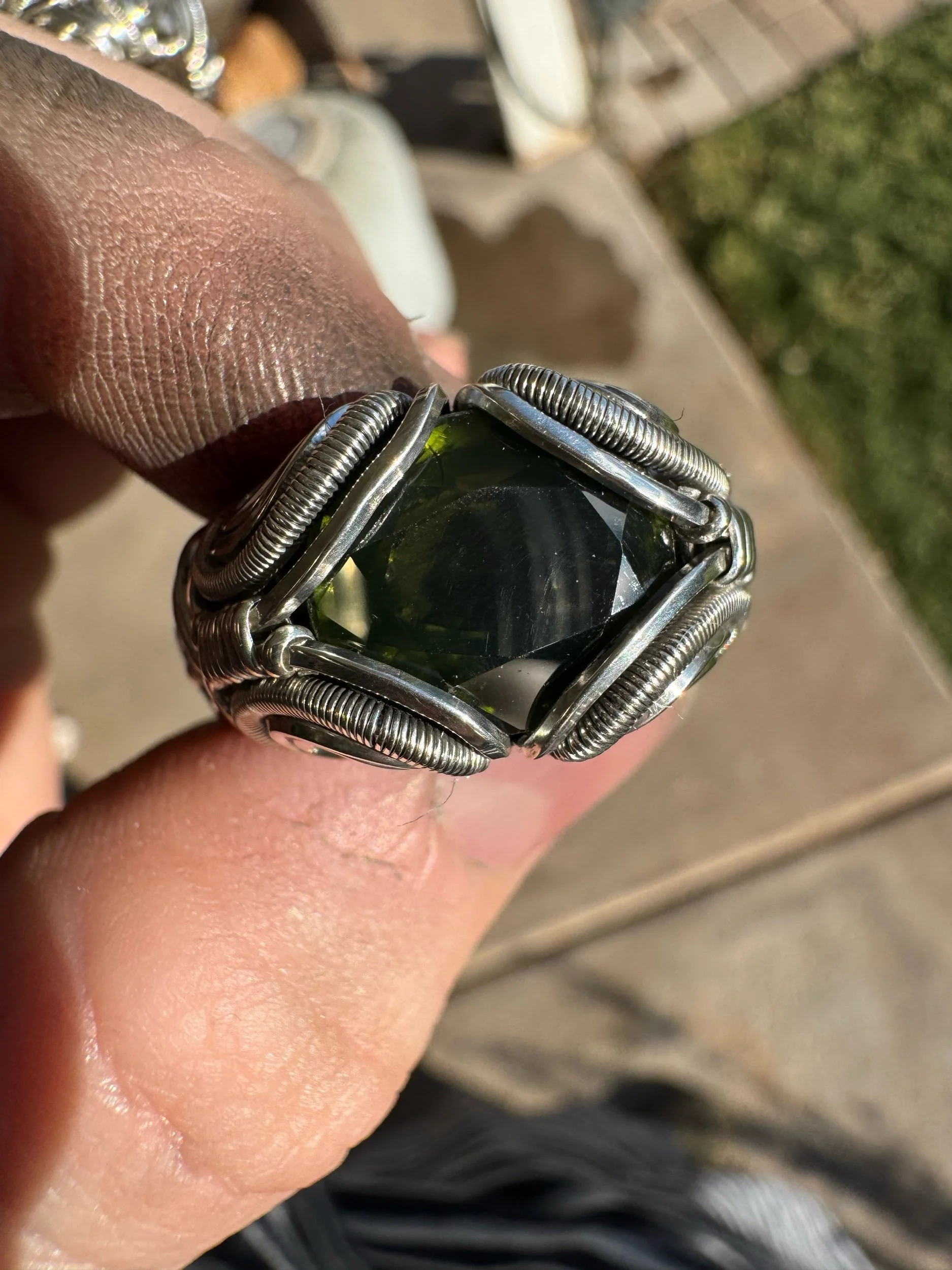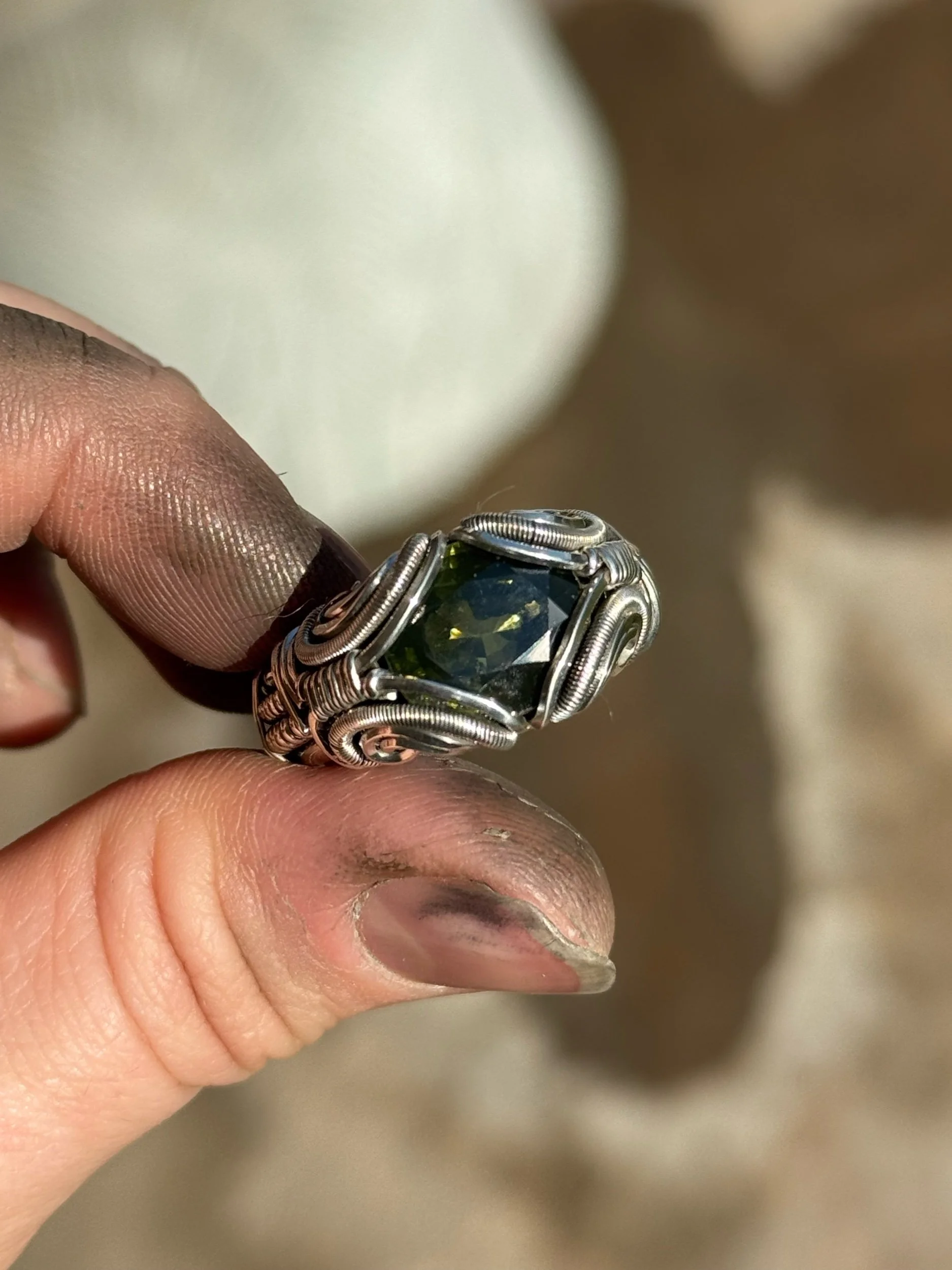 Hunter Green Zircon set in wire wrapped 925 Sterling Silver. Handmade. Size 8 US.