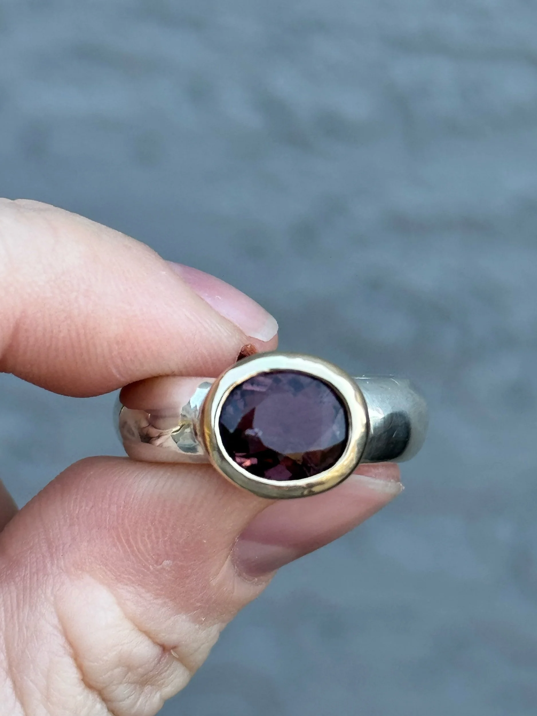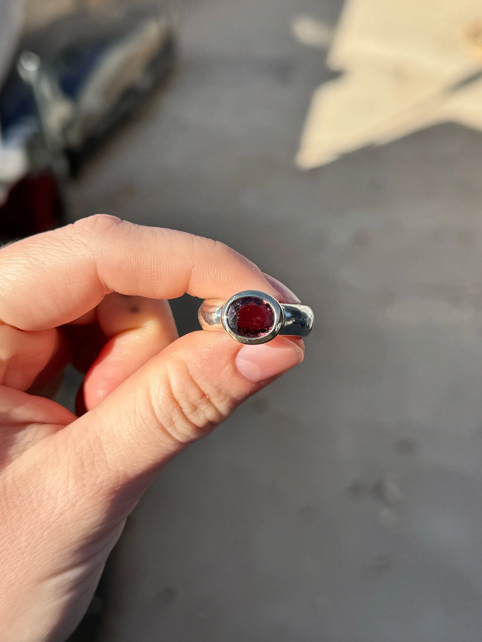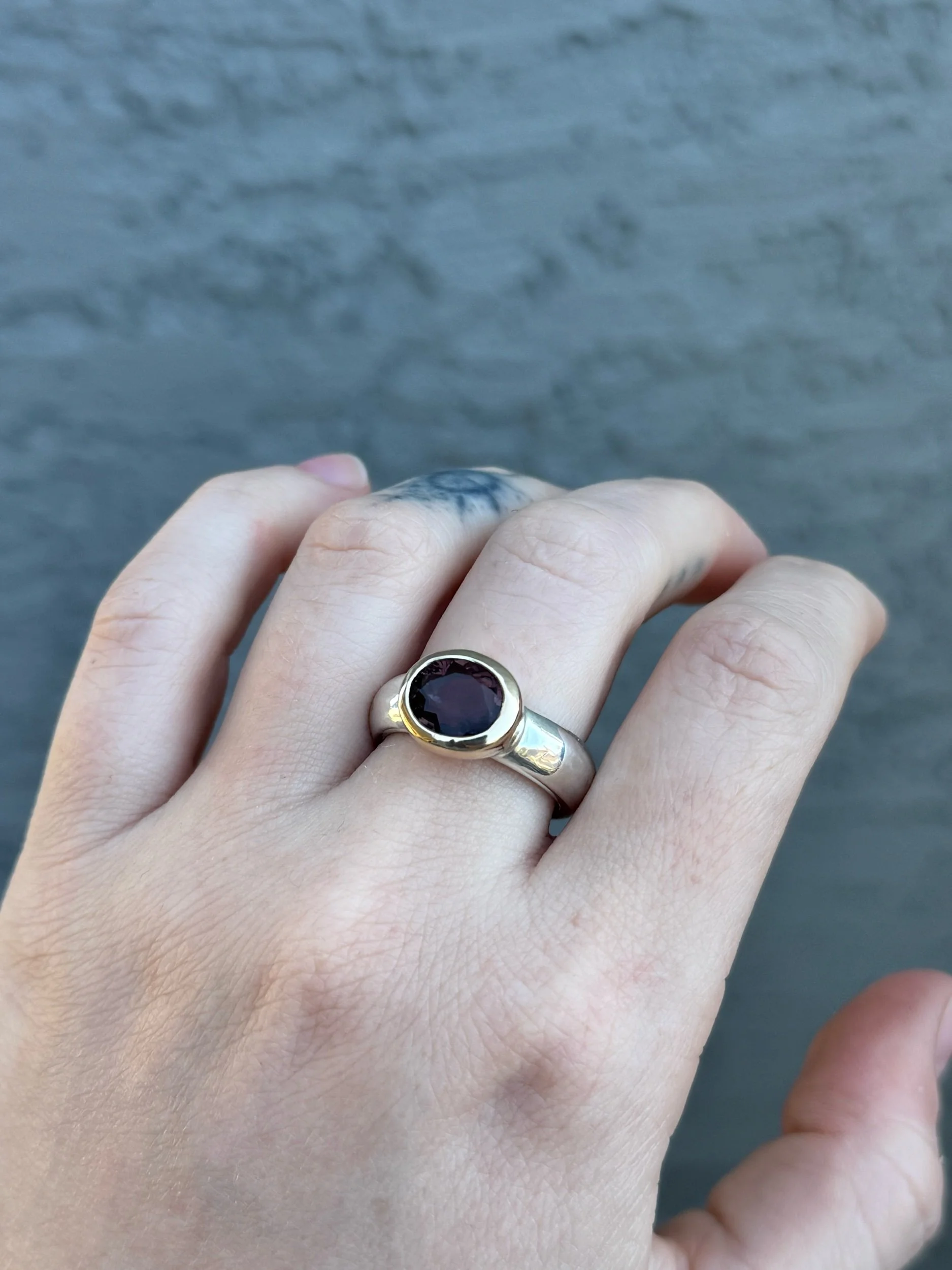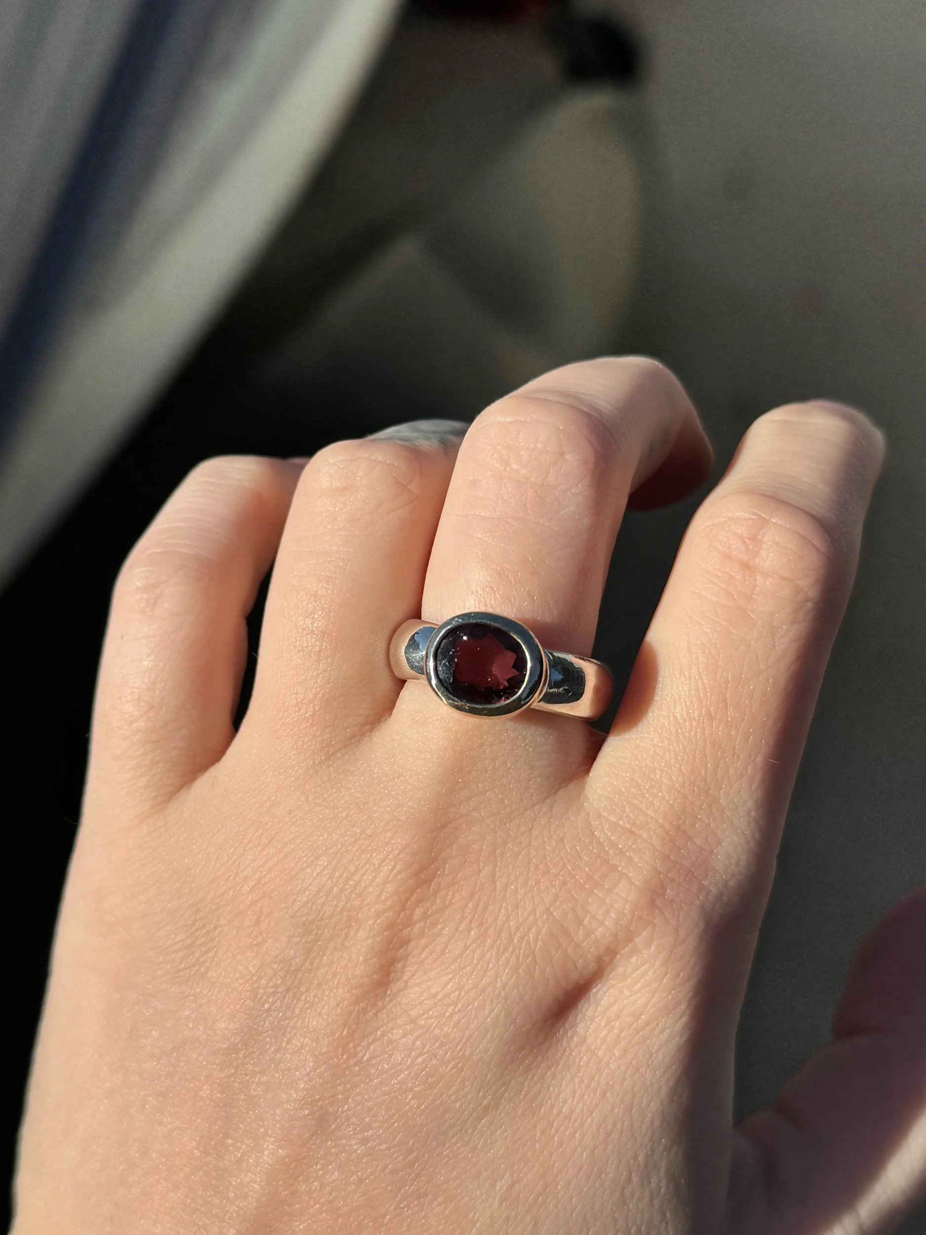 4.63ct Pink Tourmaline set in 14k gold and 925 Sterling Silver. This is a sample piece and has small imperfections (stamping, uneven proportions from the side view). Size 7.5-8 US. Loose fit 7.5 tight fitting 8.