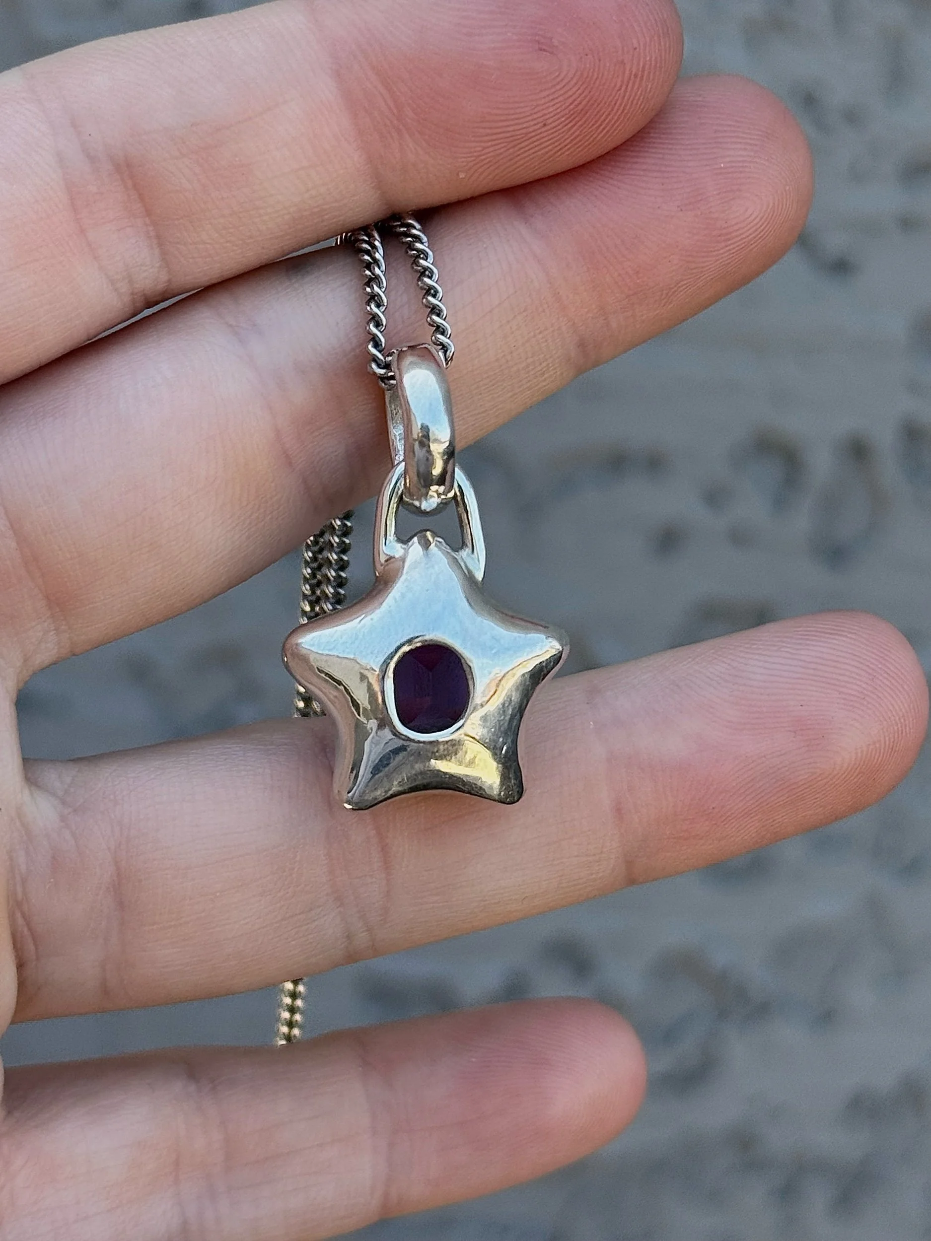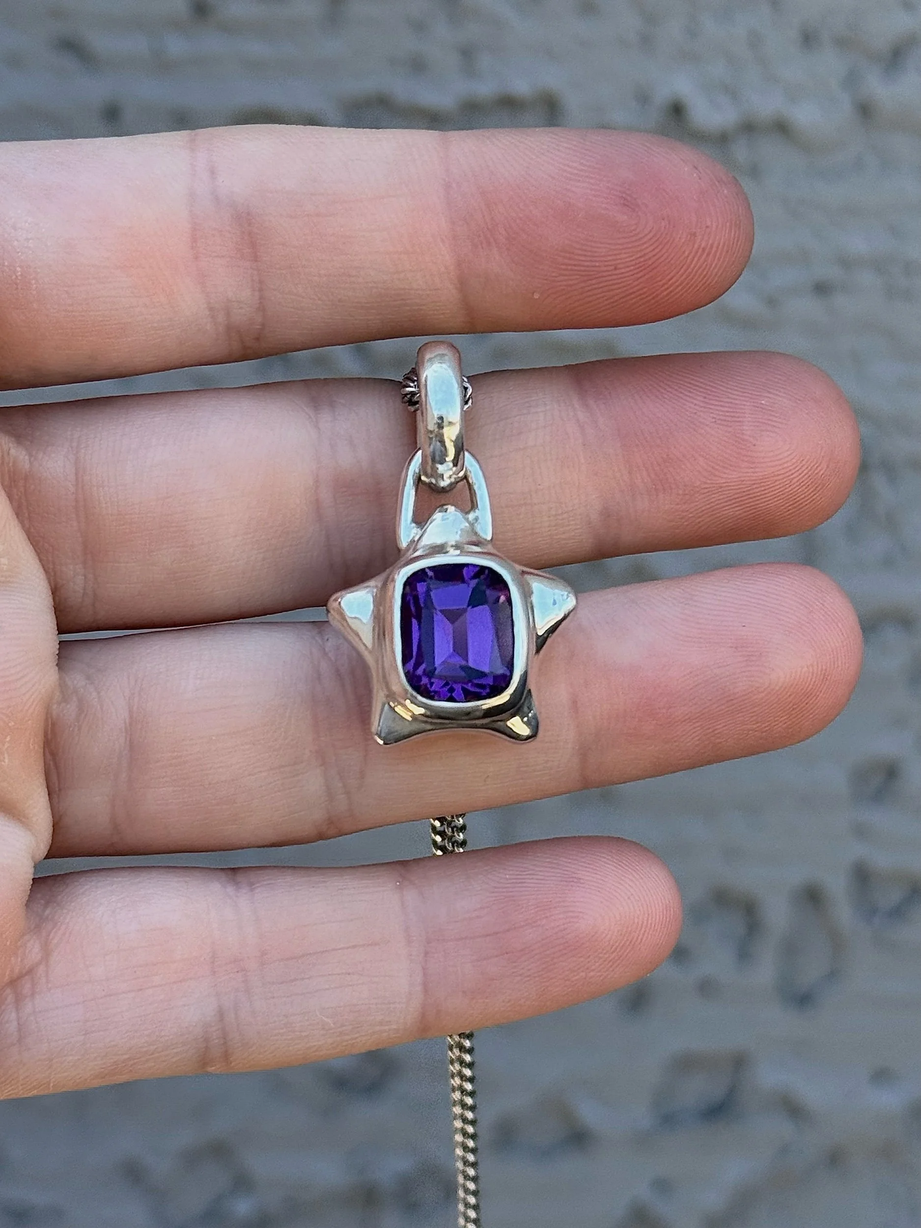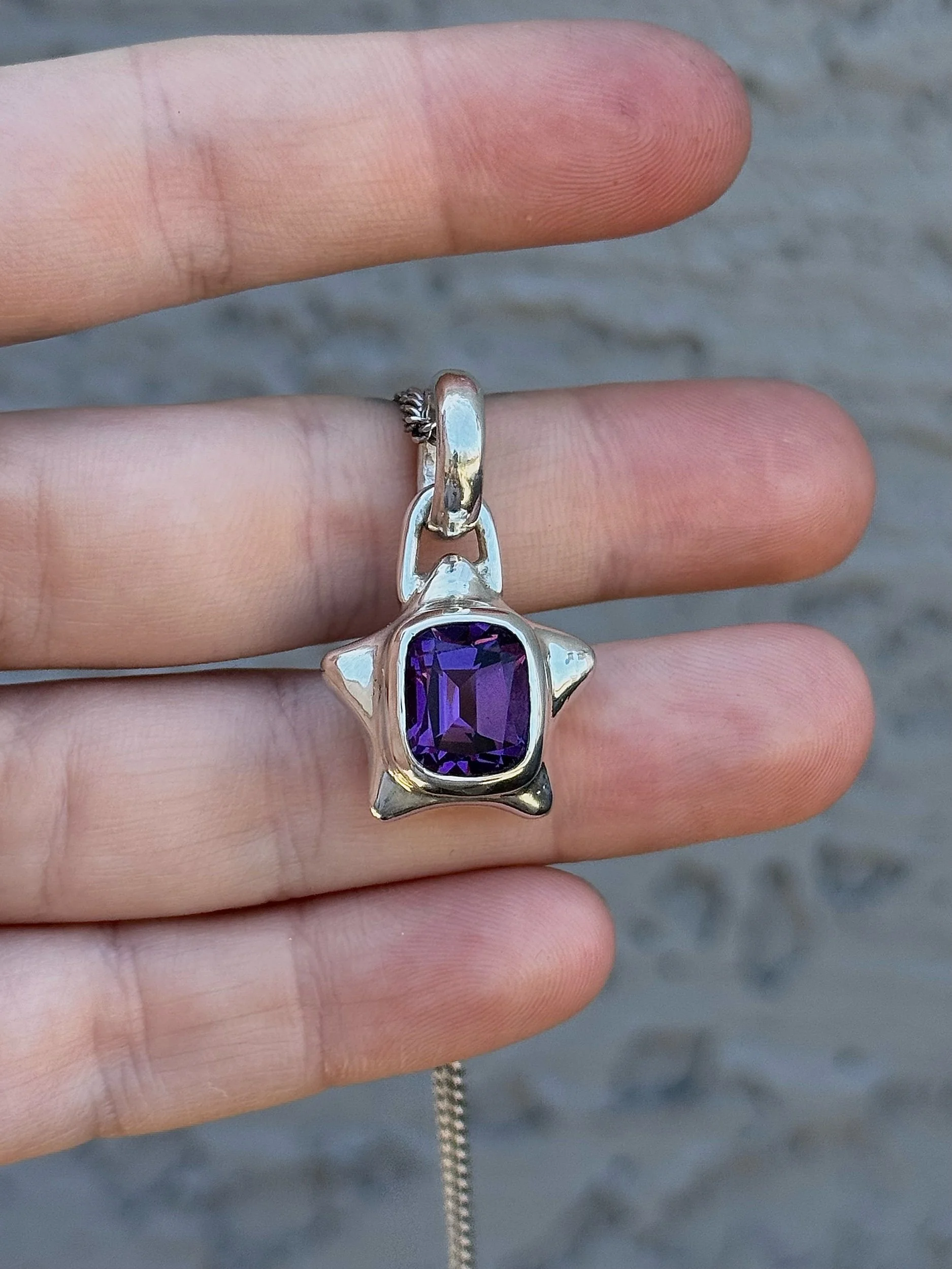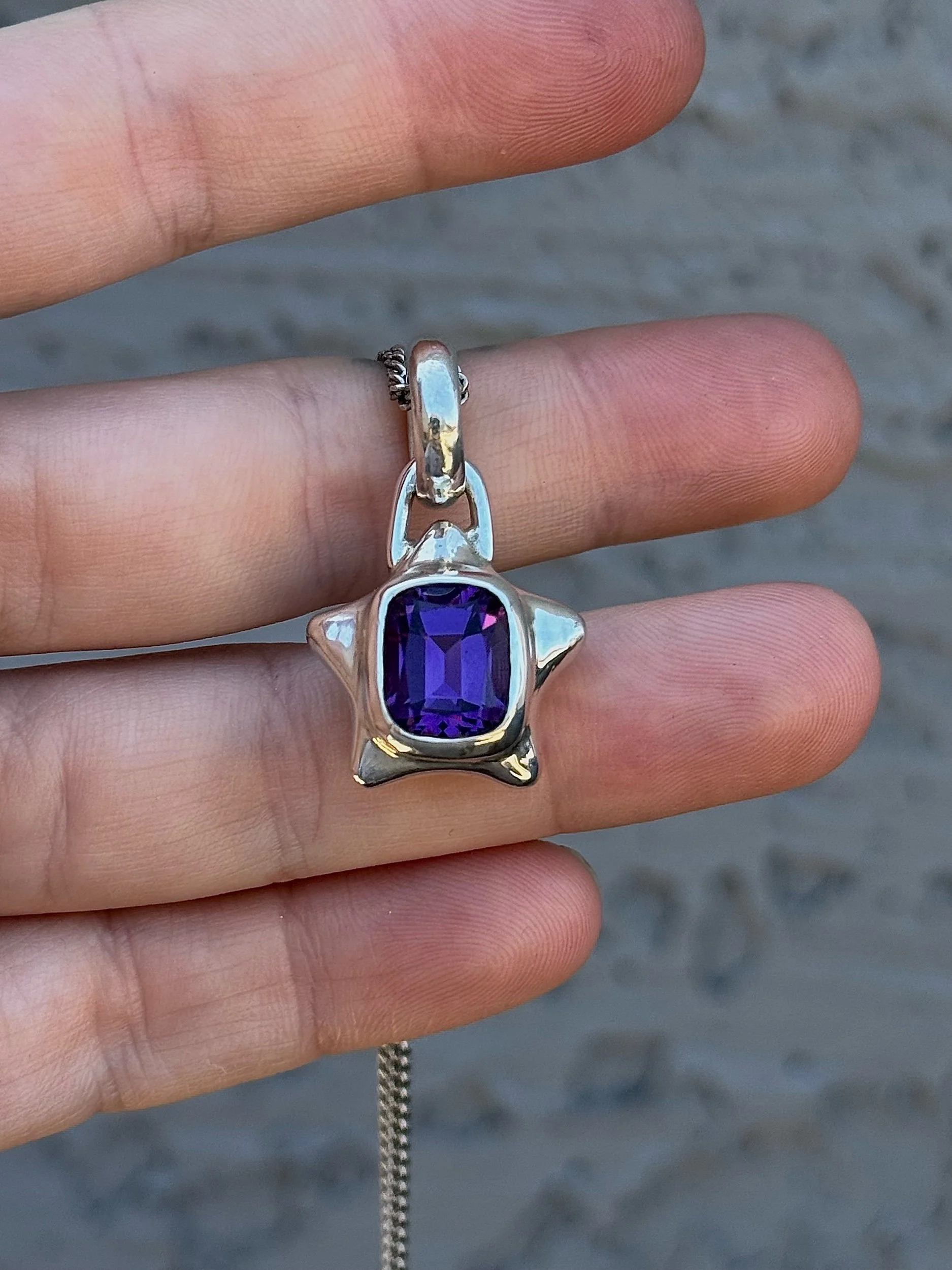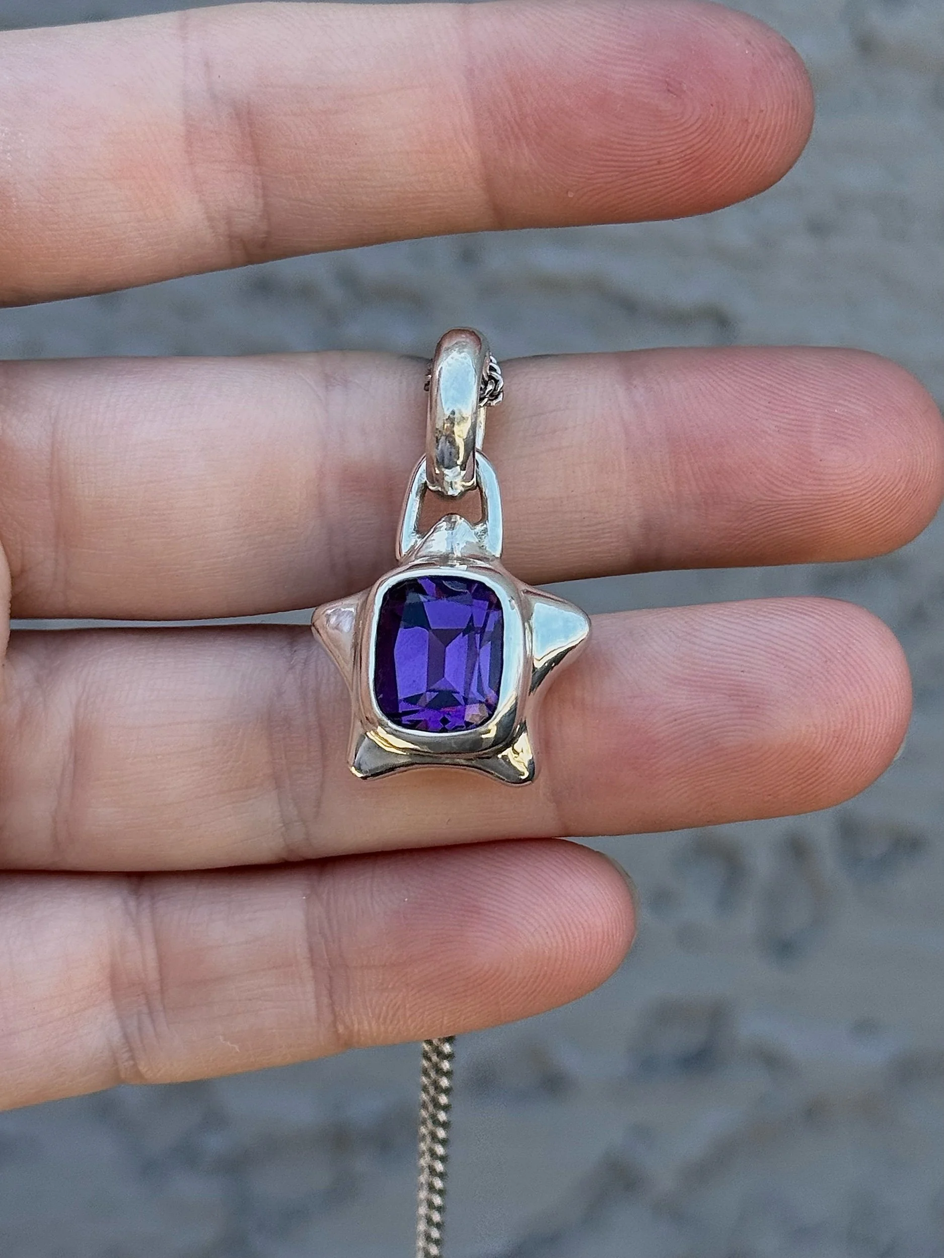 6.68ct Amethsyt set in a chubby sterling silver star. Hand carved, filed, sanded, set, polished, and finished! Weights about 13g total :)